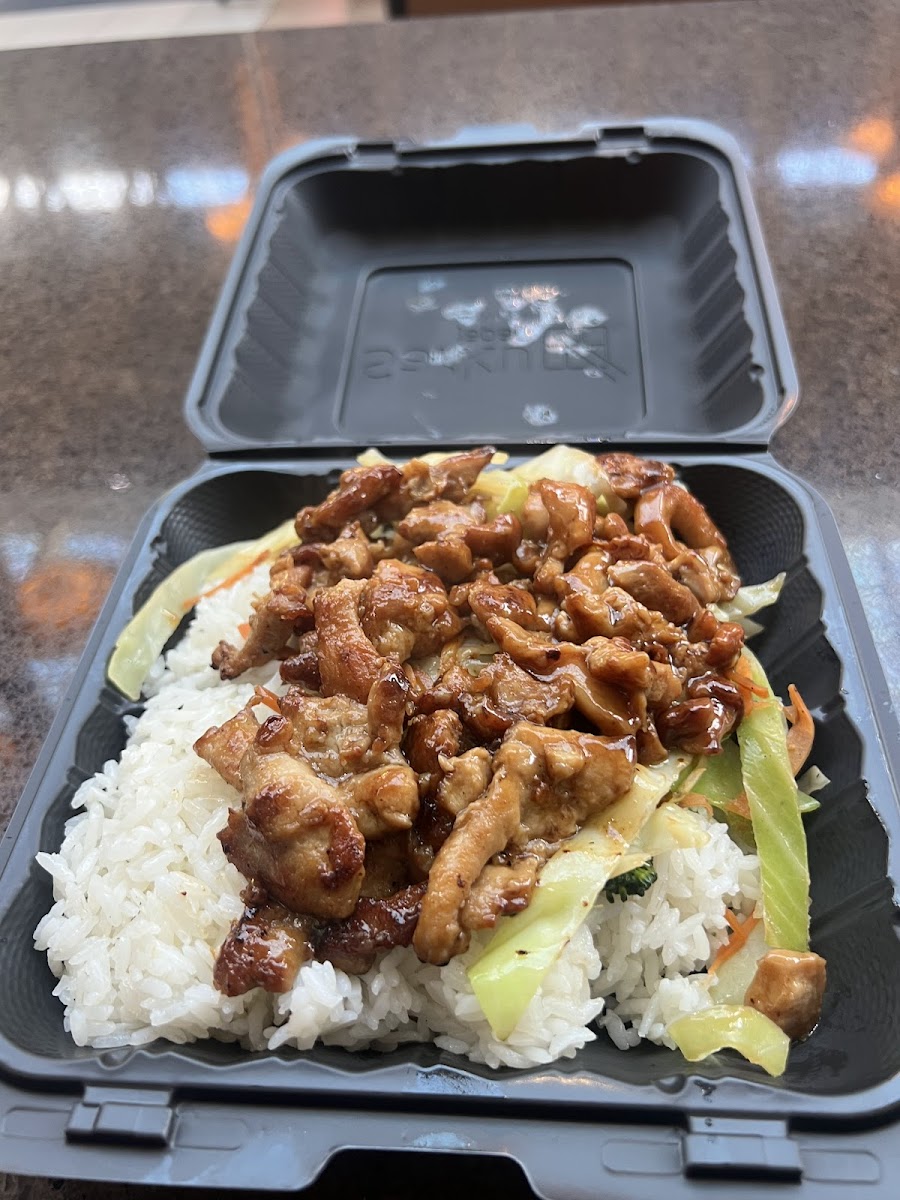 Comes with steamed white rice, garden salad, California Rolls (4), Dumplings (3). Noodles, fried rice, brown rice are available for an additional cost. 800 Calories-950 Calories.